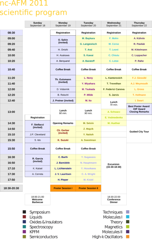The scientific program of the nc-AFM 2011 conference includes 48 talks and two poster sessions as well as an invited talk by Christoph Gerber. 10 additional talks plus 4 invited are offered by the Symposium on Quantitative Nanoscale AFM Measurements in Life Science. Please find below the program summary for both events. A PDF-file of the summary as well as of the full program (conference booklet) can be downloaded by clicking on the links below.